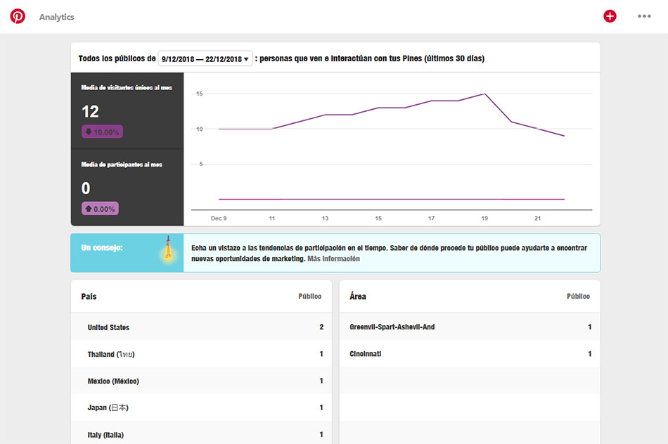 En las estadísticas vamos a poder ver el número de visitas e interacciones con nuestros pines, la procedencia demográfica de las mismas y los intereses. Una información muy valiosa que se puede ampliar si colocamos un pequeño código en nuestra web.