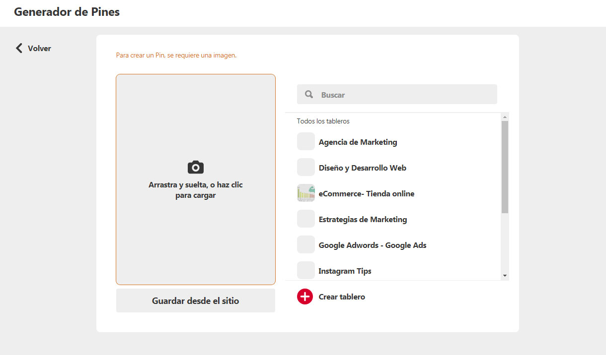 Podemos también crear un pin subiendo una imagen desde nuestro dispositivo, eligiendo el tablero donde queremos guardarlo.