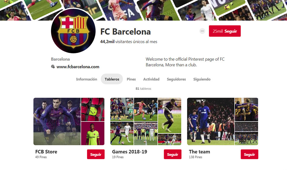 Vamos a ver dos ejemplos en el uso de Pinterest por parte de las marcas. Por una parte, vamos a señalar el perfil del Fútbol Club Barcelona. Sí, resulta curioso que un equipo de fútbol esté en esta red, pero así es.